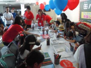 プレスの体験が出来る缶バッジ製作では、自分で描いたイラストを缶バッジやキーホルダーにすることが出来、沢山の親子連れで賑わい、大人から子どもまでモノ造りの面白さを堪能して頂きました。 また、子ども達に人気の風船や、今回初めて作成したオリジナル団扇の配布も大盛況で、例年以上の賑わいとなりました。