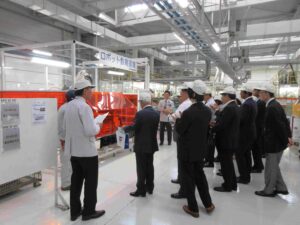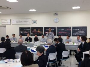 地場の異業種トップの方々への工場案内は初めての経験でしたが、始めに会社の成り立ちから経営理念、快適職場の取り組み等をご説明し、現場ではインパネメンバー専用工場としての特色を見学いただきました。