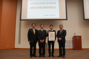 12月4日、マツダ株式会社様にて、取引先品質表彰式が行われ、弊社は「品質改善 協力賞」を受賞いたしました。