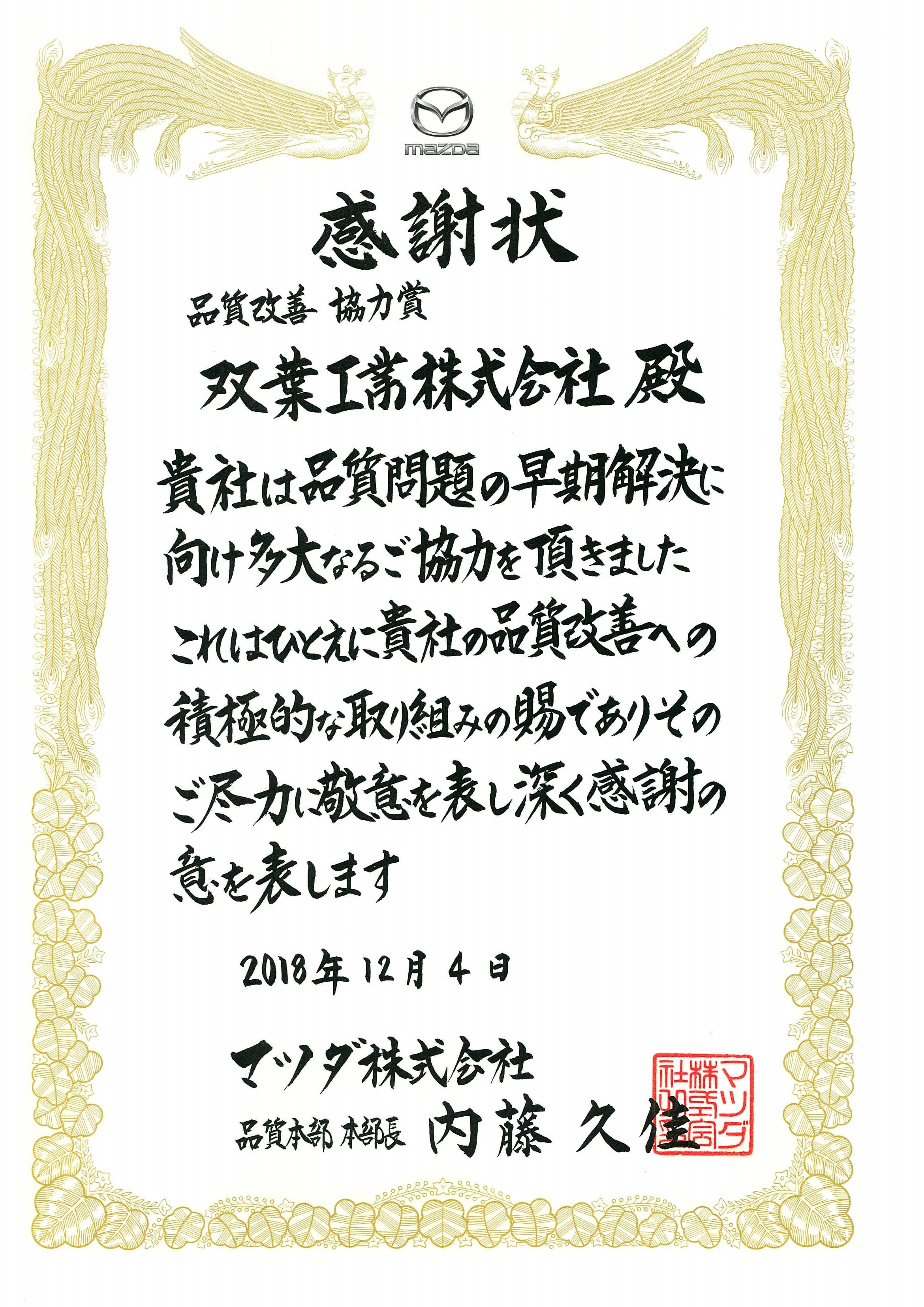 このたびは、マツダ車の品質向上に対する取組みへの協力度を高く評価していただきました。